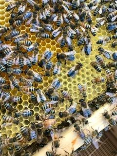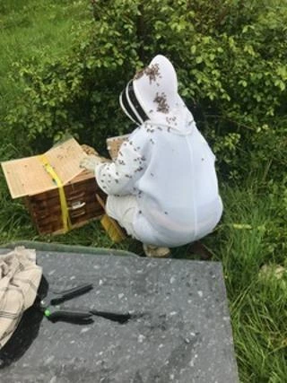 Le lendemain, un deuxième essaim s’est invité chez nous. Cette fois-ci, il s’était posé dans un rosier : un sauvetage plus facile, mais tout aussi impressionnant. Puis, un mois plus tard, un troisième essaim est arrivé. C’est à ce moment-là que tout a changé. Progressivement, nous nous sommes équipées (combinaisons, ruches, enfumoir…) et avons suivi des formations pour apprendre à prendre soin de nos abeilles dans le respect de leur bien-être et de l’environnement. C’est ainsi qu’est née notre passion pour l’apiculture et notre engagement pour une production artisanale, locale et responsable.